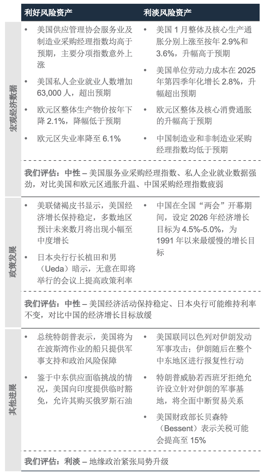 关键在于霍尔木兹海峡何时能足以让石油和天然气的运输船只安全通行,因为全球近20%的石油和天然气途经该海峡。总统特朗普提议提供军事援助和保险担保,以恢复该海峡的运输,但措施的落实需要数周时间。在此背景下,维持我们偏好风险资产的核心配置,同时建立对冲通胀升温的持仓,仍是应对不确定性的审慎做法。