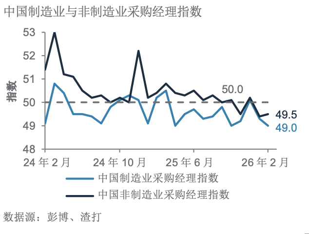 中国官方制造业采购经理指数放缓至49.0,与33个月低位持平;非制造业采购经理指数小幅上升至49.5,但低于预期