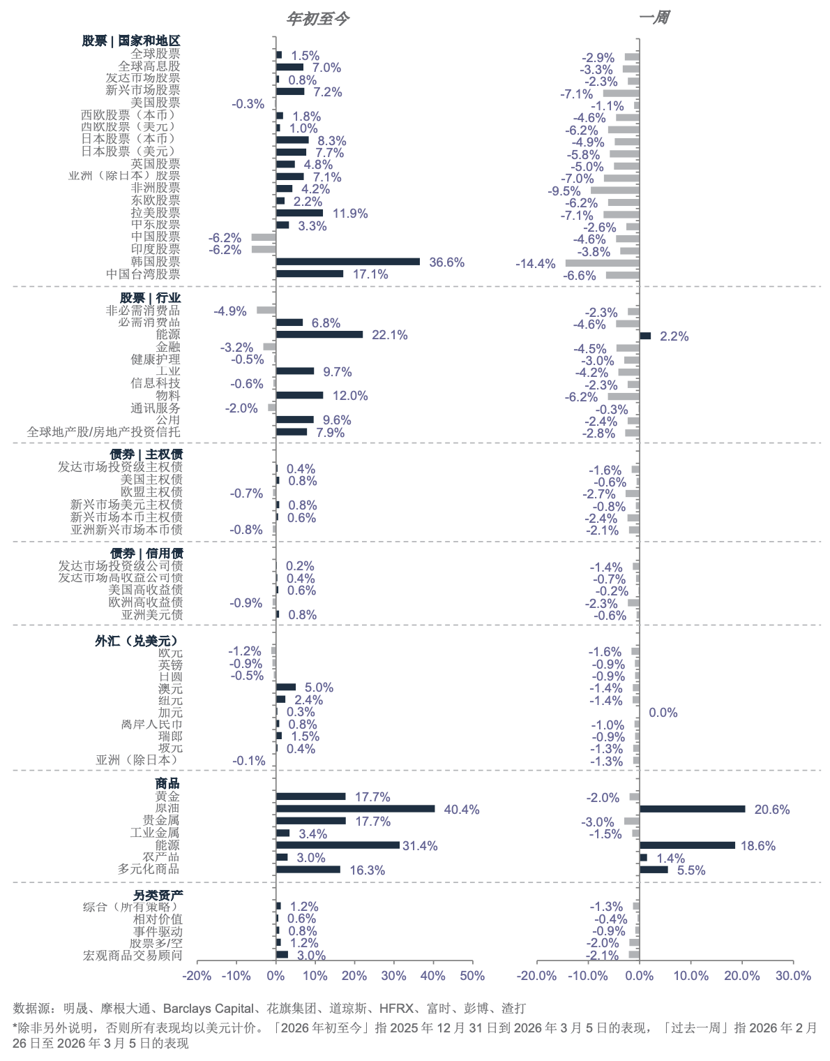 资料来源:明晟、摩根大通、Barclays Capital、花旗集团、道琼斯、HFRX、富时、彭博、渣打