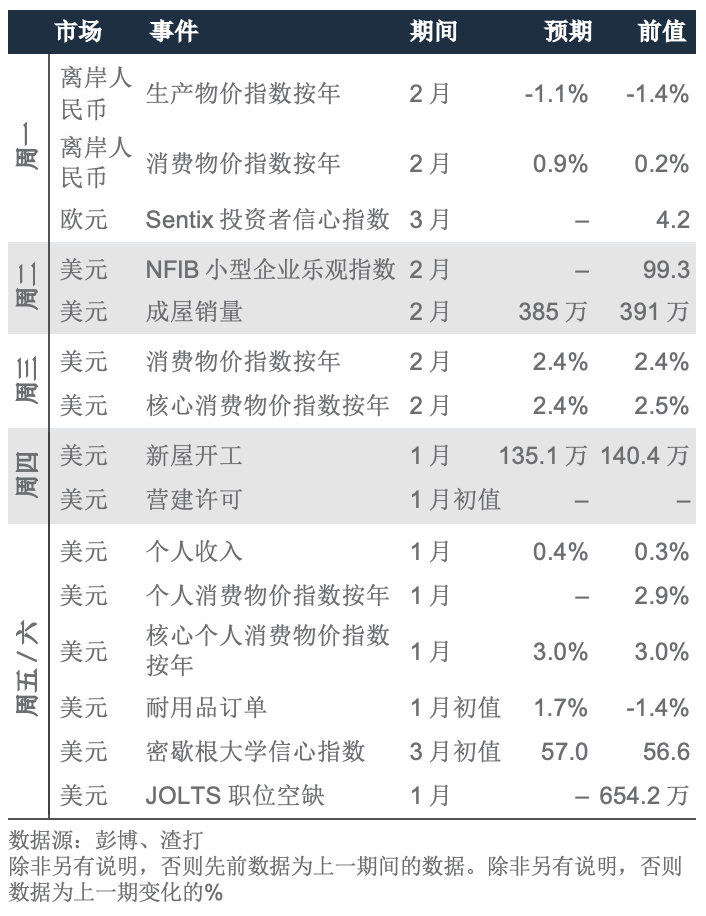 关注通胀预期。我们认为伊朗冲突持续数月的概率为30%,此情境下,油价持续上涨,通胀预期飙升,美联储减息或将推迟。截至目前为止,短期通胀预期已上升(自冲突爆发以来,美国1年期通胀掉期利率上升24个基点至2.75%),但长期通胀预期依然疲弱。美国数据显示通胀升温(1月核心生产物价通胀跃升至按年3.6%)。市场将密切关注下周的消费物价通胀数据(核心通胀的综合预期:按月0.3%,按年2.4%)。