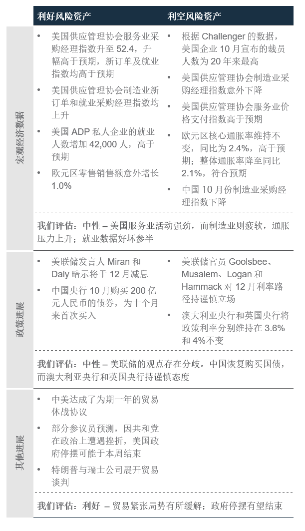 共和党最近在地方政府选举中失利后,应该会达成结束美国政府停摆的协议,以及最高法院可能颁令下调关税,或在年底前为风险资产带来利好因素。