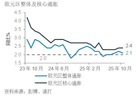 欧元区10月整体通胀降至同比2.1%,接近欧洲央行2%的目标水平;这增加了12月最后一次减息25个基点的可能性