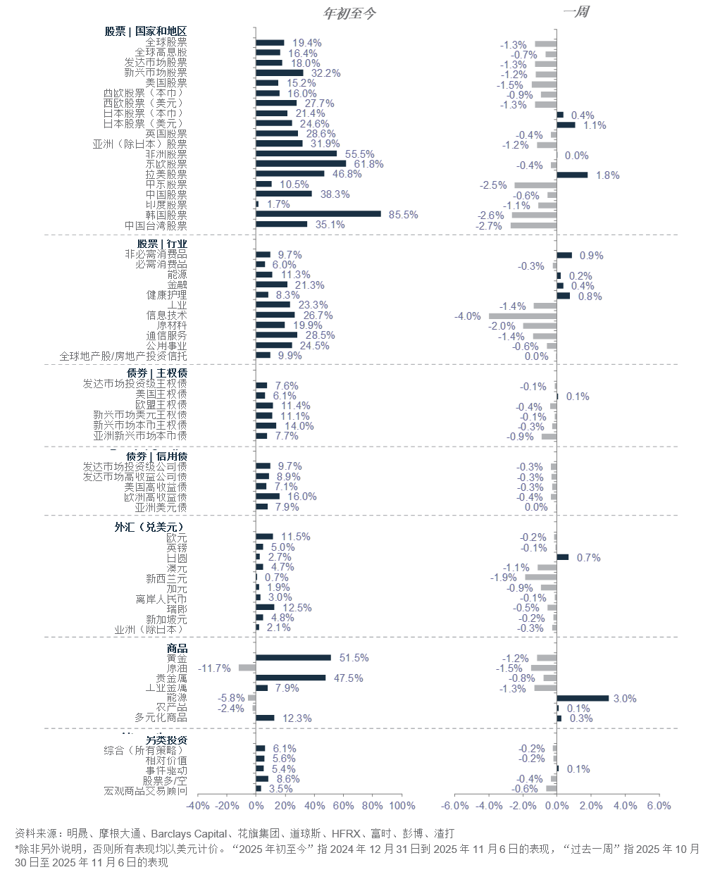 尽管仍然看涨的美国股市投资者仓位和高企的估值可能导致股市短暂回落5-10%,但美国政坛变化和法院判决可能为年底股市上涨提供下一个催化因素。共和党本周在地方政府选举中失利,应该会促使共和党与民主党达成协议,结束政府停摆。与此同时,美国最高法院在开庭提问中,似乎对特朗普关税的合法性持怀疑态度。如果能够达成协议以结束美国政府停摆,以及最高法院可能颁令下调关税,将在年底前为风险资产带来利好因素。