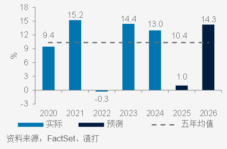 明晟中国指数2026年的每股盈利增长预期在14%以上,高于其五年均值