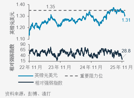 虽然减息会削弱投资者需求,通常对货币不利,但市场已反映了英国央行减息的预期。此外,英国央行预测的最终利率仍是十国集团央行中最高之一,使英镑在利差交易方面仍具吸引力,同时令造淡成本相对昂贵。尽管近期动力仍偏好美元,但英镑兑美元技术上似乎已超卖,短期内有望出现修正性反弹。我们认为1.35附近为重要阻力位。持续的财政阻力将限制英镑兑美元在此水平以上的上行空间。投资者将密切关注英国将于11月26日公布的秋季预算案。