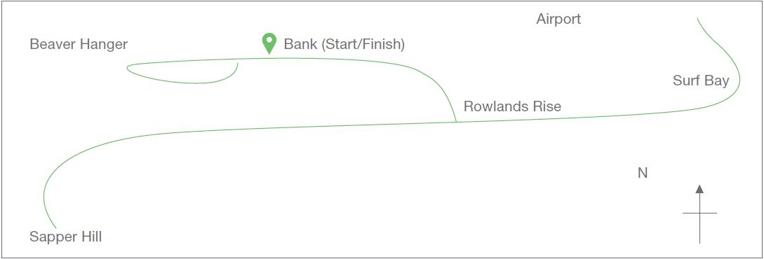 Again U turn at the airport and back along the Airport Road turning right at Rowlands Rise down the hill back into town past the bank, to the Beaver Hanger and back (via JMA) to the bank and the finish.