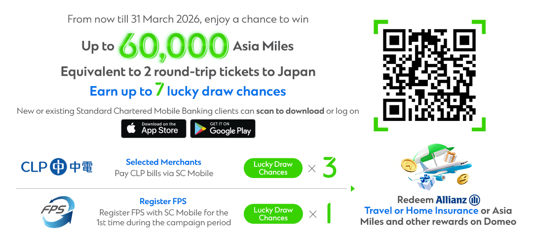 | Each electronic bill payment to CLP Power Hong Kong Limited (“CLP”) made via any one of the following ways during the Campaign Period: • Using Scan & Pay on SC Mobile; • Using “Pay FPS by Bank App” on CLP App to pay via SC Mobile; or • Using bill payment on SC Mobile or SC Online Banking. |