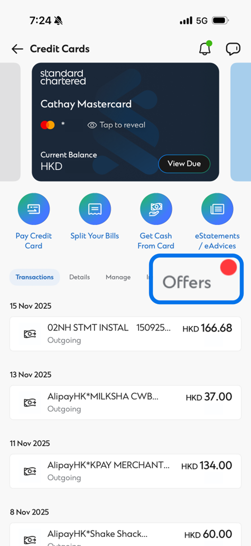 Login to SC Mobile App and select any one of your Credit Card accounts |