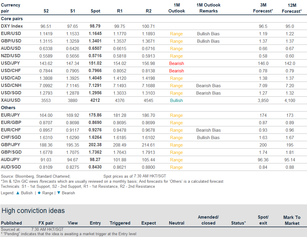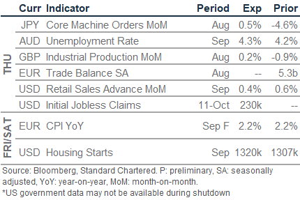 US-China trade tensions to drag USD lower: The USD index (DXY) fell 0.3% on Wednesday. US Treasury Secretary Bessent proposed a longer pause on US import tariffs on Chinese goods if China halts its plan for strict new export controls on rare-earth minerals. Meanwhile, the Fed’s Beige Book showed US economic activity was little changed in recent weeks and employment levels held largely stable, while consumer spending edged lower. Tariff-induced input costs rose, although the passthrough to consumers varied. We see risks for the USD index (DXY) skewed lower; a firm break below 98.2 (100DMA) will likely lead to a test of its next support at 97.6.