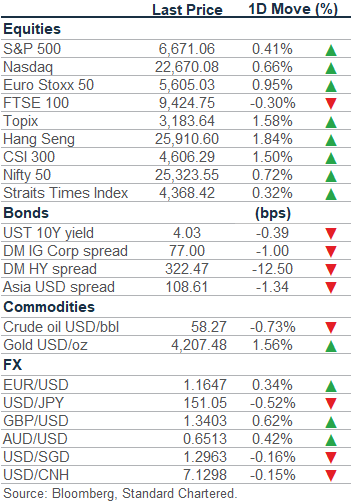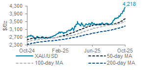 Gold faces pullback risk after scaling new record high: Gold (XAU/USD) rose 1.6%, hitting another record high of USD 4,218/oz. Although technical indicators suggest the precious metal is overbought, upside momentum remains strong. We see the pair exposed to the risk of a near-term technical correction amid potential partial profit taking. A pullback toward the 8 October high of USD 4,058/oz is likely, offering a better entry point for medium-to-long-term investors.