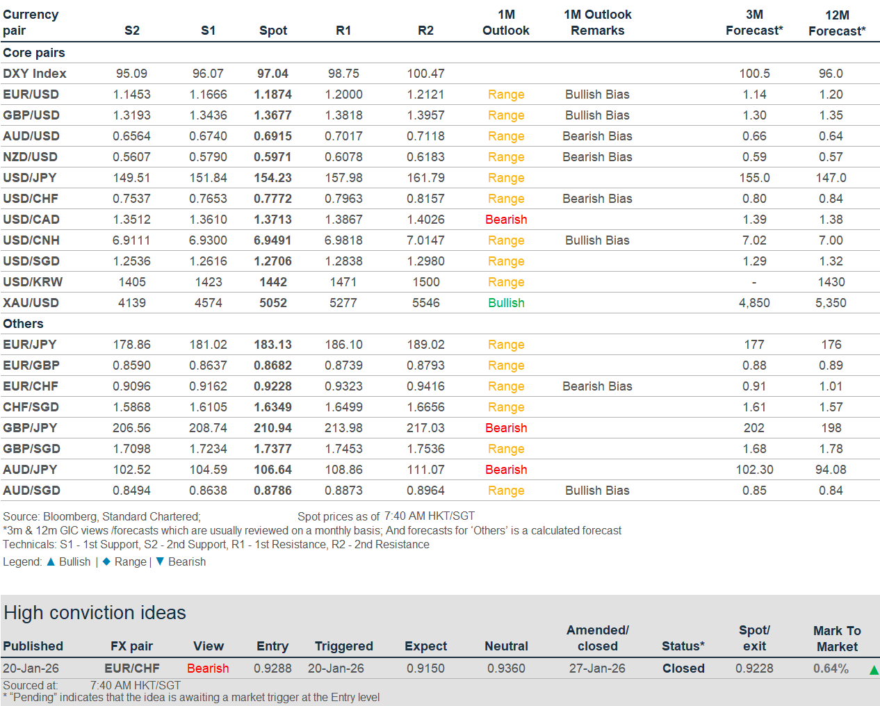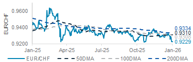 Haven currencies overbought; locking gains in CHF: Gold surged to a new record above USD 5,000/oz on Monday as investors continued to rotate into haven assets amid persistent geopolitical tensions. Meanwhile, traditional haven currencies strengthened, with USD/CHF falling to a fresh one-year low and USD/JPY marking its strongest two-day decline since April following Prime Minister Takaichi’s warning of potential government intervention to defend its currency. However, the recent rapid moves have pushed both pairs into oversold territory, suggesting limited scope for further downside. We have closed our bearish EUR/CHF trade to lock in gains amid stretched positioning.