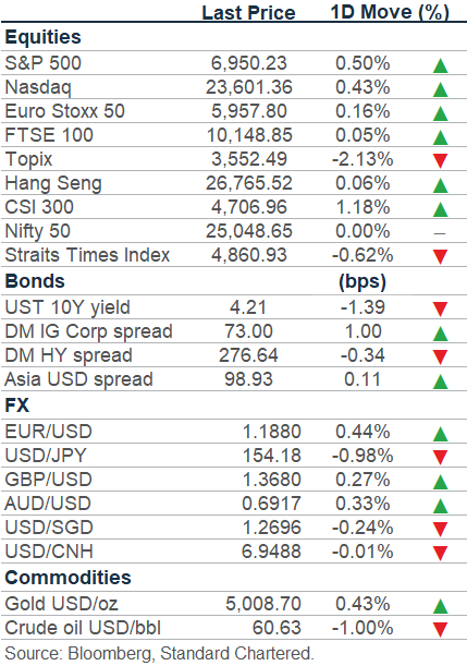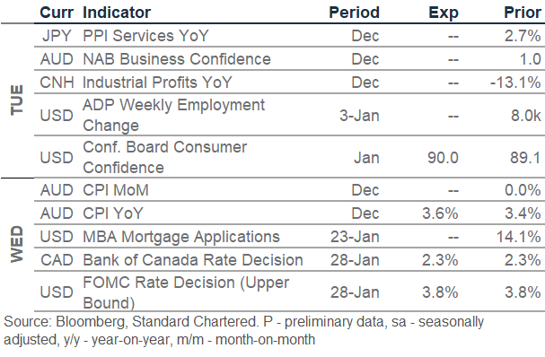 USD oversold; limited downside likely ahead of Fed meeting: The USD extended its decline on Monday to the weakest level since September as deteriorating trade relations between the US and its allies weighed on the US growth outlook. Meanwhile, US capital goods orders beat expectations in November, reversing the prior month’s contraction. Non-defence capital goods orders excluding aircraft – a key gauge of business investment – rose 0.7%, pointing to resilient equipment spending. Attention now turns to the Conference Board’s consumer confidence data due tonight and Fed Chair’s comments after the policy meeting tomorrow (the Fed is expected to hold rates). We see strong support for the USD index (DXY) at its one-year low of 96.2.