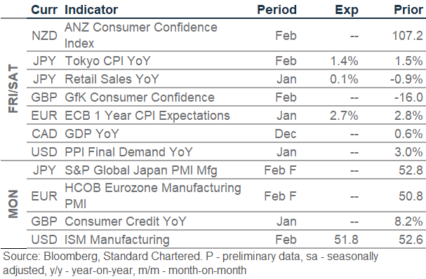 USD/CAD rangebound with bearish bias: Foreign direct investment into Canada surged in Q4, driven by strong M&A-related inflows. USD/CAD was largely unchanged following the release as investors await Canada’s December GDP data due tonight. We maintain a rangebound view with a bearish bias on the pair. While progress was reported in US-Iran nuclear talks overnight, the risk of renewed geopolitical tensions could trigger a spike in oil prices, buoying CAD. The next USD/CAD support level stands at 1.3548.