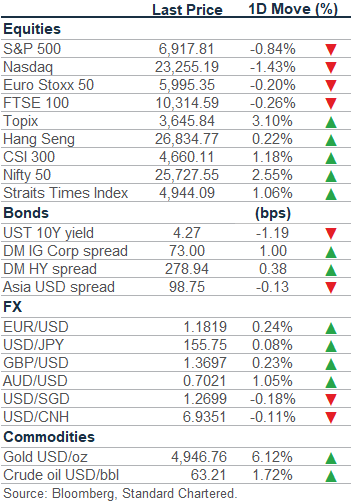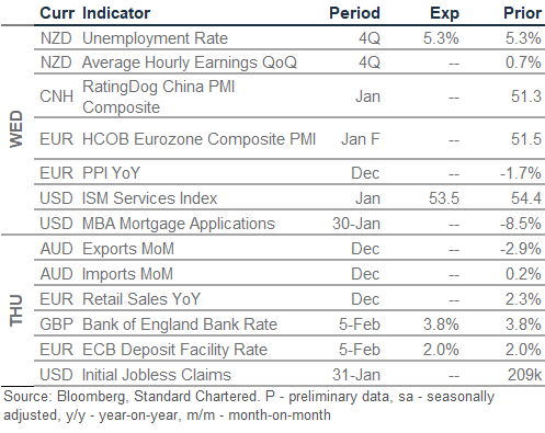 JPY little changed ahead of election: USD/JPY rose 0.1%. Japan’s Finance Minister Katayama concurred with Prime Minister Takaichi’s view that a weak yen presents both advantages and disadvantages and stressed that Japan continues to coordinate closely with the US on FX markets as needed. We anticipate increasing volatility ahead of the lower house election on 8 February, with rising expectations that Takaichi’s Liberal Democratic Party-led coalition will secure a comfortable victory. Such a result would pave the way for more aggressive fiscal policy, adding pressure on JPY. Any USD/JPY upside may be offset by a broadly softer dollar and potential intervention around 158-160.