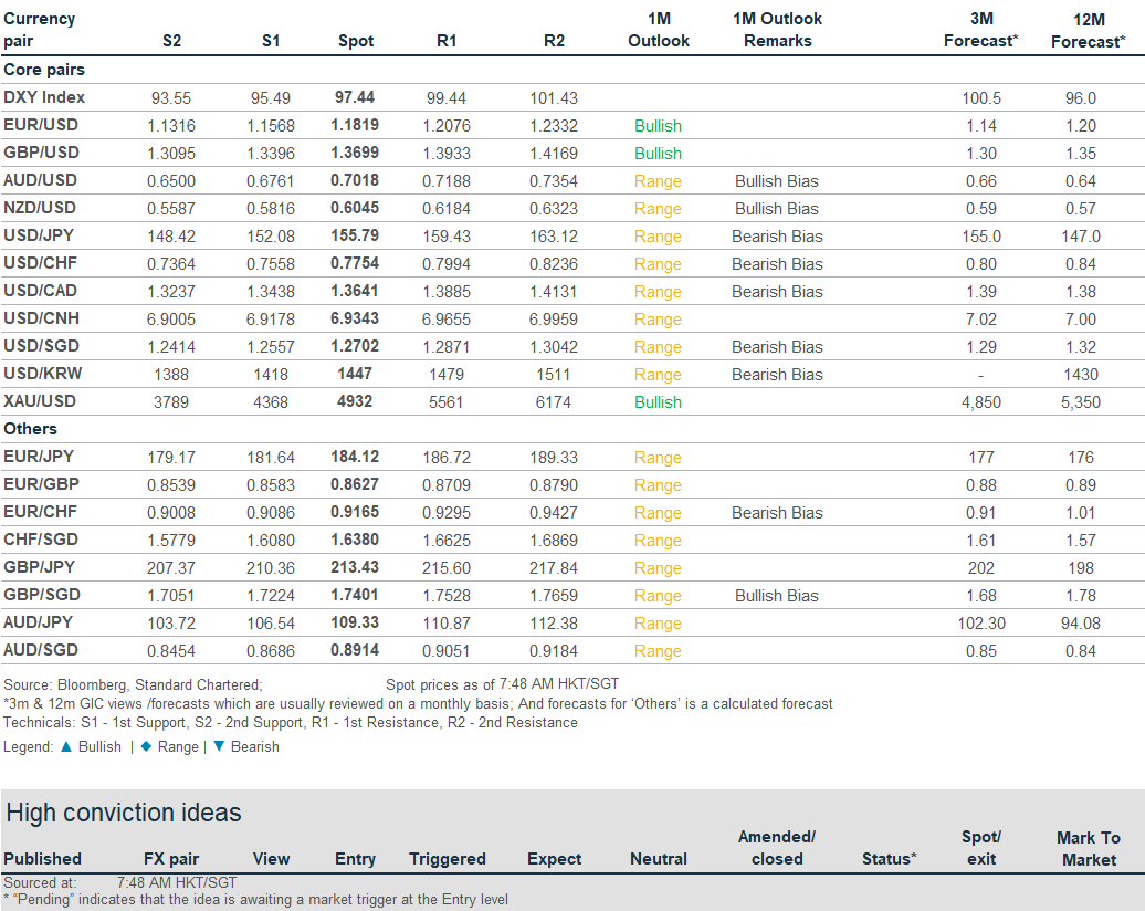 Banking activities may be carried out internationally by different branches, subsidiaries and affiliates within the Standard Chartered Group according to local regulatory requirements. Opinions may contain outright “buy”, “sell”, “hold” or other opinions. The time horizon of this opinion is dependent on prevailing market conditions and there is no planned frequency for updates to the opinion. This opinion is not independent of Standard Chartered Group’s trading strategies or positions. Standard Chartered Group and/or its affiliates or its respective officers, directors, employee benefit programmes or employees, including persons involved in the preparation or issuance of this document may at any time, to the extent permitted by applicable law and/or regulation, be long or short any securities or financial instruments referred to in this document or have material interest in any such securities or related investments. Therefore, it is possible, and you should assume, that Standard Chartered Group has a material interest in one or more of the financial instruments mentioned herein. Please refer to our Standard Chartered website under Regulatory disclosures for more detailed disclosures, including past opinions/ recommendations in the last 12 months and conflict of interests, as well as disclaimers. A covering strategist may have a financial interest in the debt or equity securities of this company/issuer. All covering strategist are licensed to provide investment recommendations under Monetary Authority of Singapore or Hong Kong Monetary Authority. This document must not be forwarded or otherwise made available to any other person without the express written consent of Standard Chartered Group.