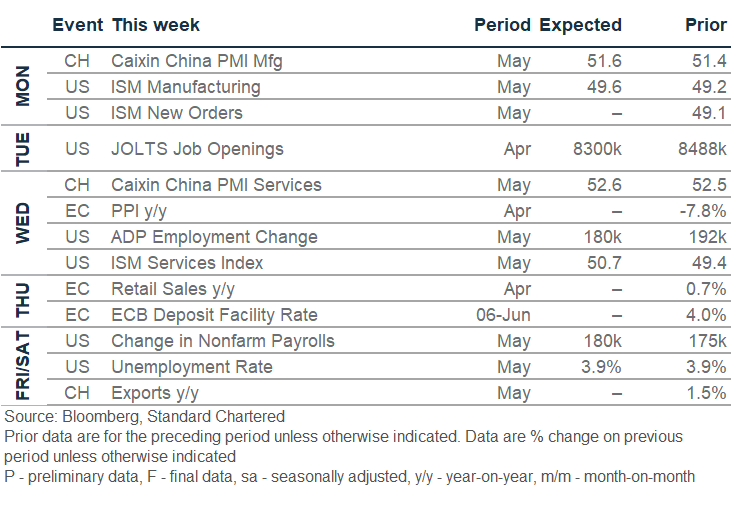 The ISM Services PMI broadly surpassed expectations in May. Headline readings of 53.8 returned to expansion following a one-month contraction in April; services new orders also edged higher to 54.1. Upbeat services PMI was in sharp contrast with the weaker-than-expected manufacturing ISM figures earlier this week which added to chorus signaling cooling economic growth in the US. Besides, ADP employment change came in below estimates at 152,000 in May after a downward revision in the previous month, dragged by a steep decline in the manufacturing sector. The US government bond yields continued to fall, with both the 10-year and 2-year yield tumbling by 5 basis points to 4.28% and 4.72%, respectively. We are in focus of the ECB policy meeting later today where markets are pricing in a 25bps rate cut, in line with our estimates. We expect a total of 75bps cuts likely this year.