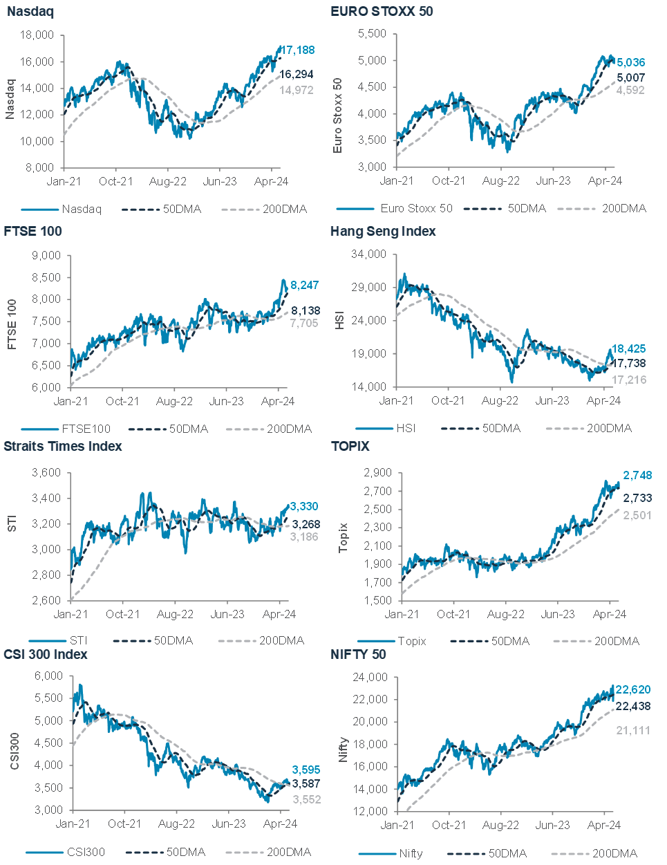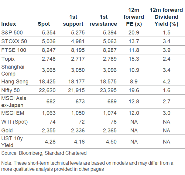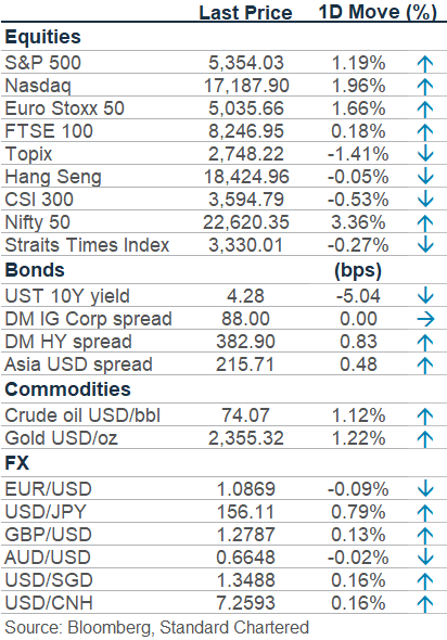 US equities rose on Wednesday, led by a rally in major technology stocks. Weaker-than-expected labor market data fueled hopes for an imminent Fed pivot, boosting investor sentiment. The S&P 500 index reached a new intraday record high and closed above 5,350, with the next technical resistance at 5,394. The Nasdaq Composite index rose by almost 2%. Nvidia led the growth among the “Magnificent 7”, reaching a market value of USD 3 trillion. Apple marked its eighth consecutive day of gains. We maintain an overweight position on the US Technology sector amid a strong earnings growth outlook. Meanwhile, Asian equities traded mixed on Wednesday. Despite stronger-than-expected Caixin services PMI data highlighting continued strength in the services sector, China and Hong Kong stocks declined. In contrast, Indian equities rebounded as Prime Minister Modi’s ally affirmed support for government formation. Korean equities also rose to a one-week high, driven by gains in major technology stocks.
