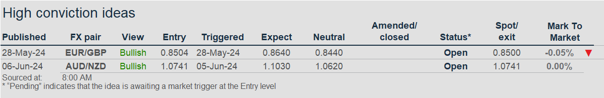 USD/CAD rose 0.1% following an anticipated 25bps interest rate cut from the Bank of Canada (BOC). This move, ahead of other G7 central banks, was accompanied by Governor Tiff Macklem’s comment that the path of interest rates is likely to be gradual. The market is now pricing in approximately a 70% chance of another rate cut in July. This week, balance of trade and employment data will be closely watched. We see the pair consolidating at 1.3670 with neutral technical indicators. The USD Index (DXY) remained little changed after data showed the US services sector rebounded in May following a contraction in April. However, cooling employment change data has added to the uncertainty surrounding the expected start of the Fed’s easing cycle later this year. We continue to see support at 103.1 while awaiting the Fed policy decision next week. Gold rose 1.15% on mixed US data and expectations of a Fed rate cut. The metal is likely to test its next resistance at USD 2,420/oz. Based on technical opportunities, we initiate a bullish AUD/NZD trade idea to capitalize on an expected short-term rebound.