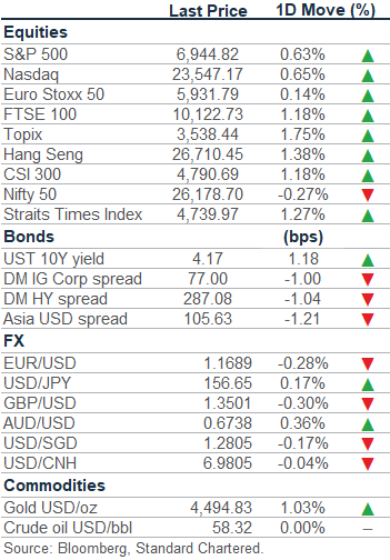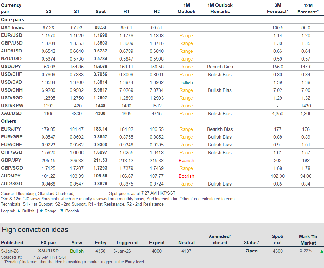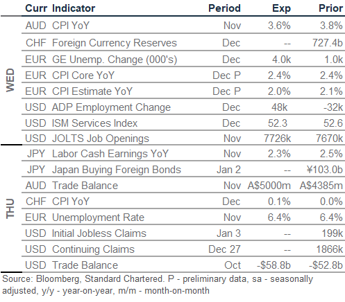 USD to consolidate ahead of jobs data: The USD index (DXY) rose 0.3% on a soft EUR which fell 0.3% against the USD as German inflation slowed to 1.8% y/y in December, from 2.3% y/y, missing expectation. The US 10-year government bond yield rose 1.18bps to 4.17% amid a large slate of corporate-bond sales. We see the DXY consolidating around 98.6 (100-day moving average). EUR/USD is likely to find immediate support at 1.1610 ahead of Euro area inflation data today. US private sector payrolls, ISM services PMI and job openings data today and official payrolls data on Friday are the next focus.