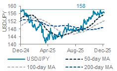 Rangebound GBP with bullish bias: GBP/USD pared initial gains to end the day 0.3% lower. The pair has reversed all losses sustained in the run-up to the UK government’s budget announced in late November. GBP remains one of the highest yielding currencies, despite the Bank of England’s decision to lower rates by a further 25bps to 3.75% at the end of 2025. UK PM Starmer has hinted at a more conciliatory approach towards post-Brexit relations with the Euro area. This is potentially positive for UK growth and investment prospects. On charts, the pair remains on its upward channel, with resistance at 1.3590.