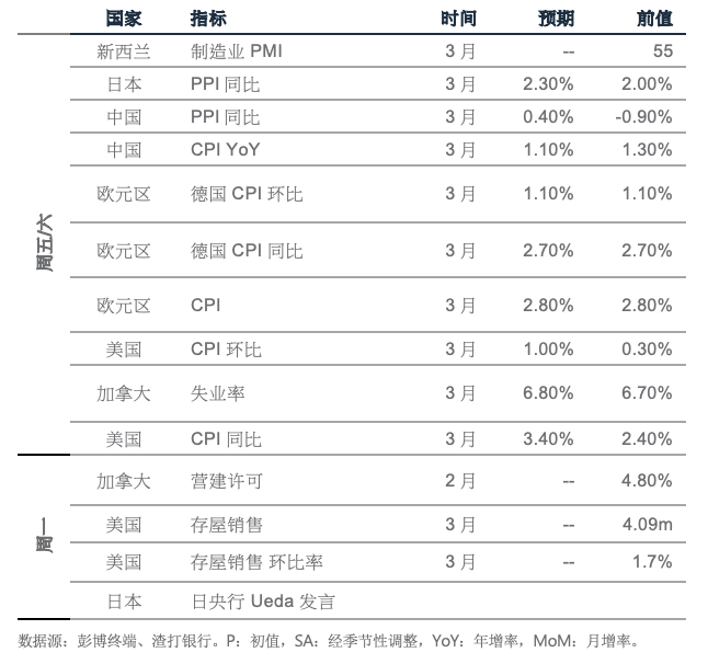 中东紧张局势缓和,美元面临下行压力:中东局势缓和,美元指数(DXY)连续第四个交易日下跌。美国将与以色列和黎巴嫩举行会谈,讨论正在进行的停火谈判。此前,伊朗议会议长称黎巴嫩是“停火不可分割的一部分”。特朗普表示,他对与伊朗达成协议“非常乐观”。同时,美联储首选的通胀指标-2月个人消费支出物价指数(PCE)同比上涨2.8%,基本上符合预期,核心PCE同比升3%。个人收入下滑0.1%,但消费者支出按月升0.5%,与通胀顽固相符。动量指标显示美元可能进一步走低,可能测试98.6,即50日移动均线附近的短期支撑位。市场焦点现在转向将于今日稍后公布的3月通胀报告。