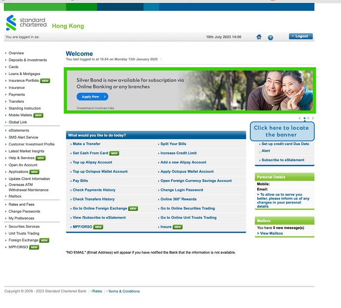1. Hold a valid Hong Kong Identity Card 2. Were born on or before 31 December 1966 3. Have a valid single name Debt Securities Account and a valid single name HKD Settlement Account 4. Have registered for Online Banking service 5. Non-US person or non-Canada resident 6. Address not in U.S. or Canada 7. Able to see the Silver Bond banner after logging into Online Banking |