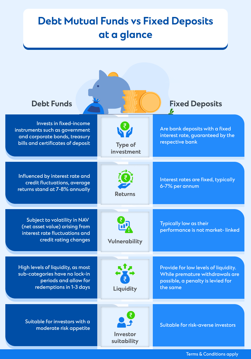 Debt mutual funds are not the only preferred instrument for capital preservation in India. Fixed deposits have long been popular with investors seeking low risk levels and assured returns. While their USPs overlap, it is also essential to distinguish between the two, given they react differently to market dynamics and their returns and liquidity levels vary.