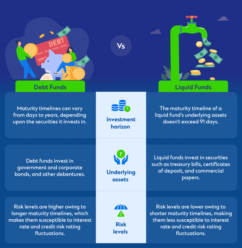 Liquid funds invest in short-term instruments such as treasury bills, commercial papers, certificates of deposit, and collateralised borrowing and lending obligations (CBLO). For them to qualify as one, the underlying instruments must have a maturity period of no longer than 91 days.