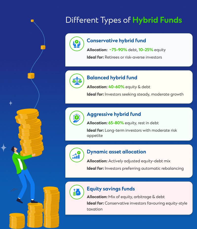 | Feature | Hybrid Funds | Debt Funds | Equity Funds |