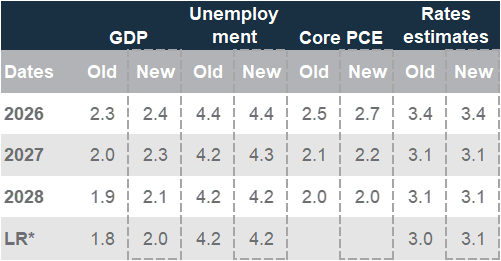 The Fed revised higher its growth and inflation estimates for 2026-27, while maintaining its projection for one rate cut in 2026 and another cut in 2027