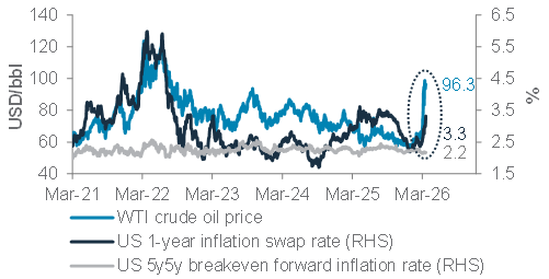 US short-term inflation expectations have risen with the surge in oil prices, but long-term inflation expectations remain subdued