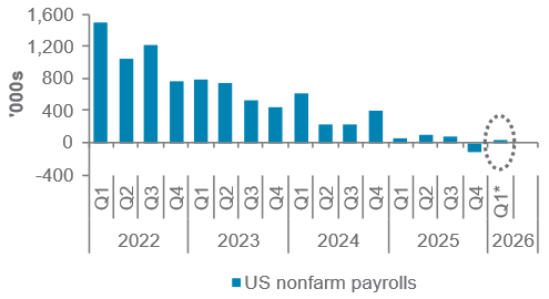 Source: Bloomberg, Standard Chartered; Q1 2026 reflects January and February net nonfarm payrolls