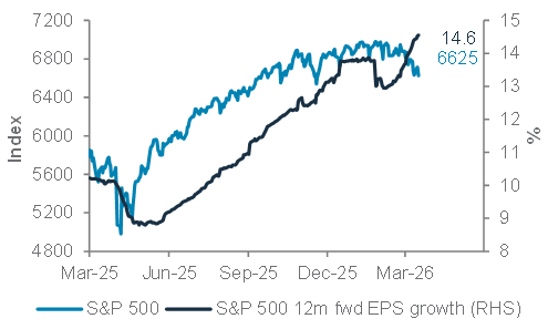 US equity valuations turn attractive. US corporate earnings estimates have been revised higher in recent weeks, despite the pullback in equities due to the Middle East conflict. This has made US equity valuations more attractive, especially if the conflict proves short-lived (our base case) and oil prices fall back towards USD 70-80/bbl. The robust US earnings outlook is led by the tech-sector which is benefitting from structurally strong AI-related investments.