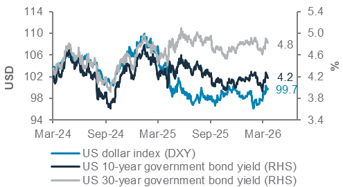 Await opportunity to lock in bond yields. The negative growth impact of higher oil prices is limiting how high bond yields can rise. Any sign of the conflict ending would likely lead to a pullback in US bond yields and the USD. In that scenario, markets are likely to refocus on expected policy divergence, with the Fed cutting rates later this year to support a flagging job market, while other central banks hold (ECB) or hike (BoJ, RBA) rates. We expect the USD index (DXY) to end the year around 96, almost 4% weaker than today, while the US 10-year government bond falls towards 3.75-4.0% range.