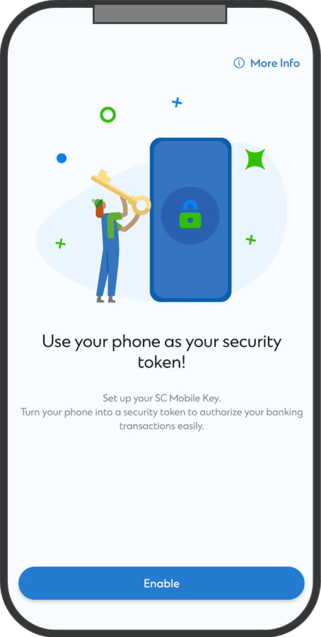 SC Mobile Key is an enhancement to your SC Mobile App that enables you to authenticate your online and mobile banking logins. With the SC Mobile Key enabled on your mobile device, there is no longer need for any SMS OTP to login.