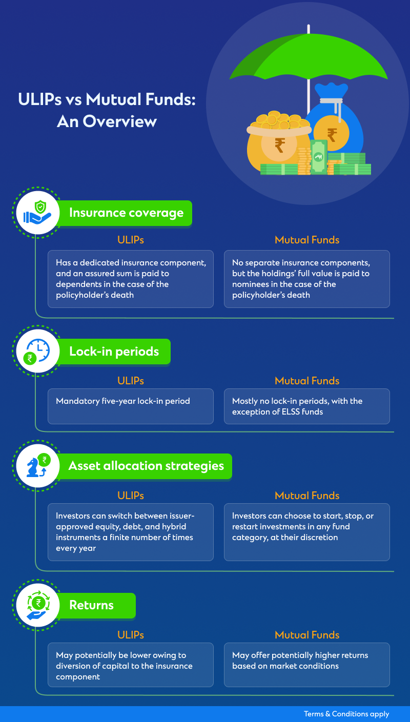 When it comes to a comparison of returns on ULIPs and mutual funds, the former may offer lower returns. This is because one’s capital is partially diverted to insurance premium payments alongside investments. On the other hand, with mutual funds, the entirety of one’s capital is directed towards investments, resulting in potentially better long-term performance subject to market conditions.