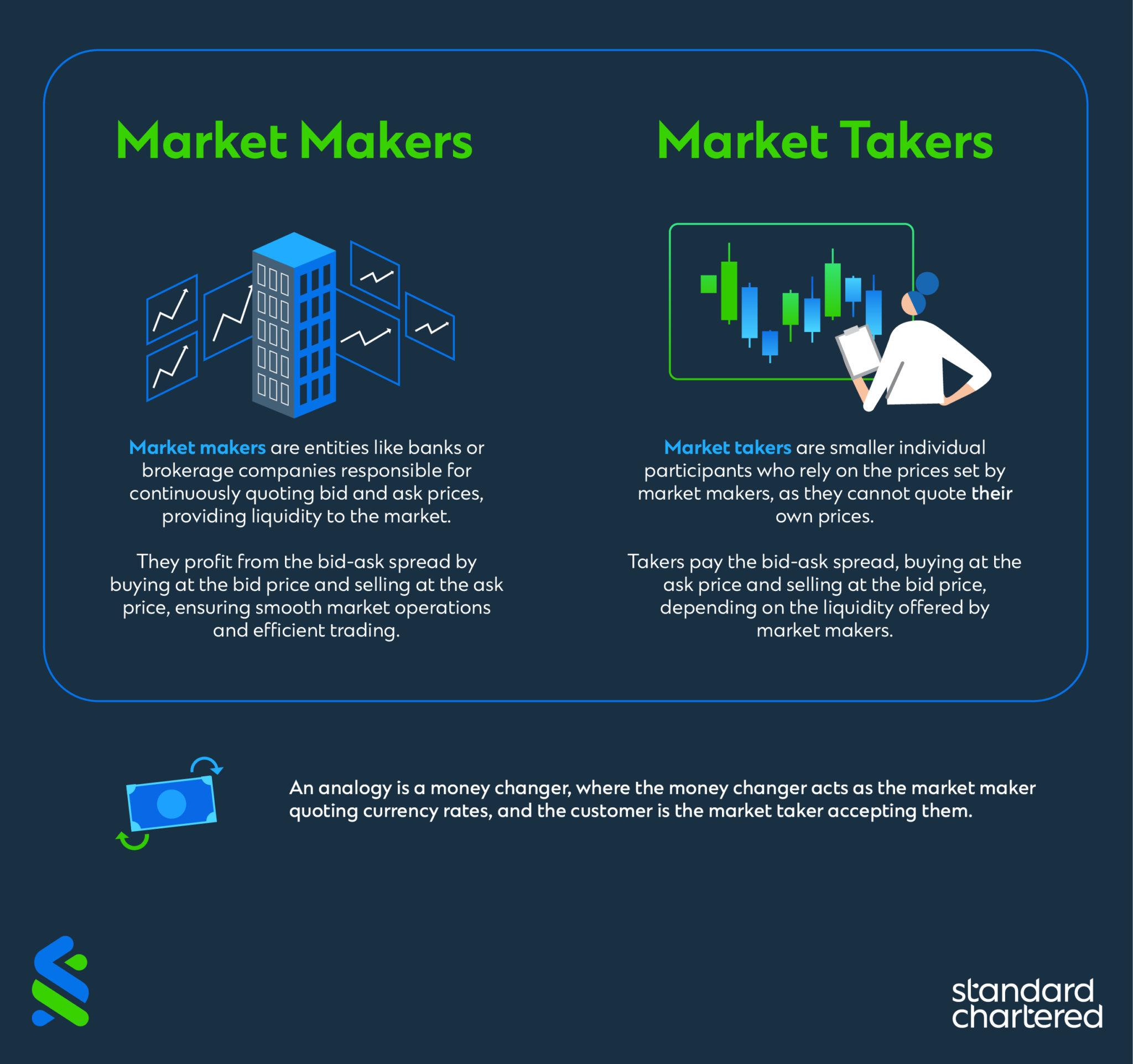 - Market takers are smaller individual participants who can only ‘take’ the prices market makers offer.
