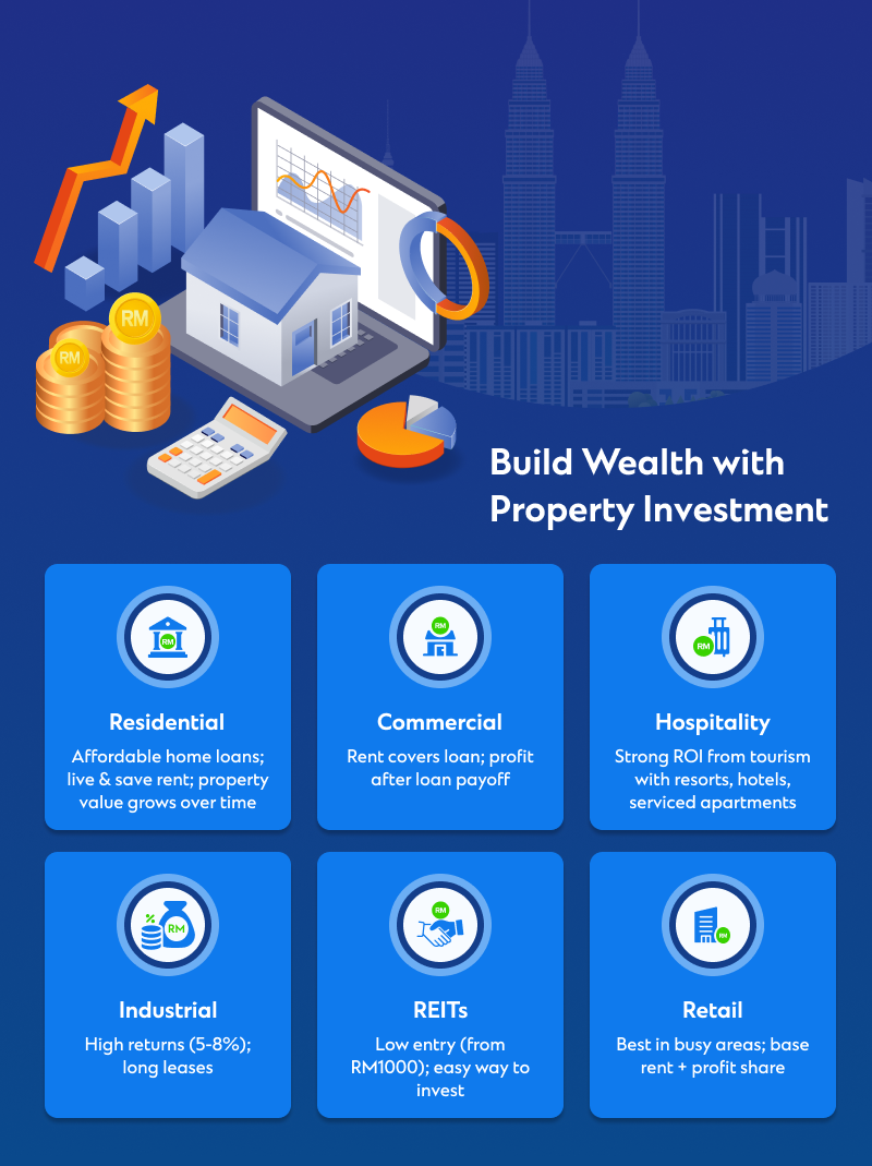 - Industrial spaces and hotels bring higher returns, while investing in REITs (real estate investment trusts) allows you start small with just RM1,000.