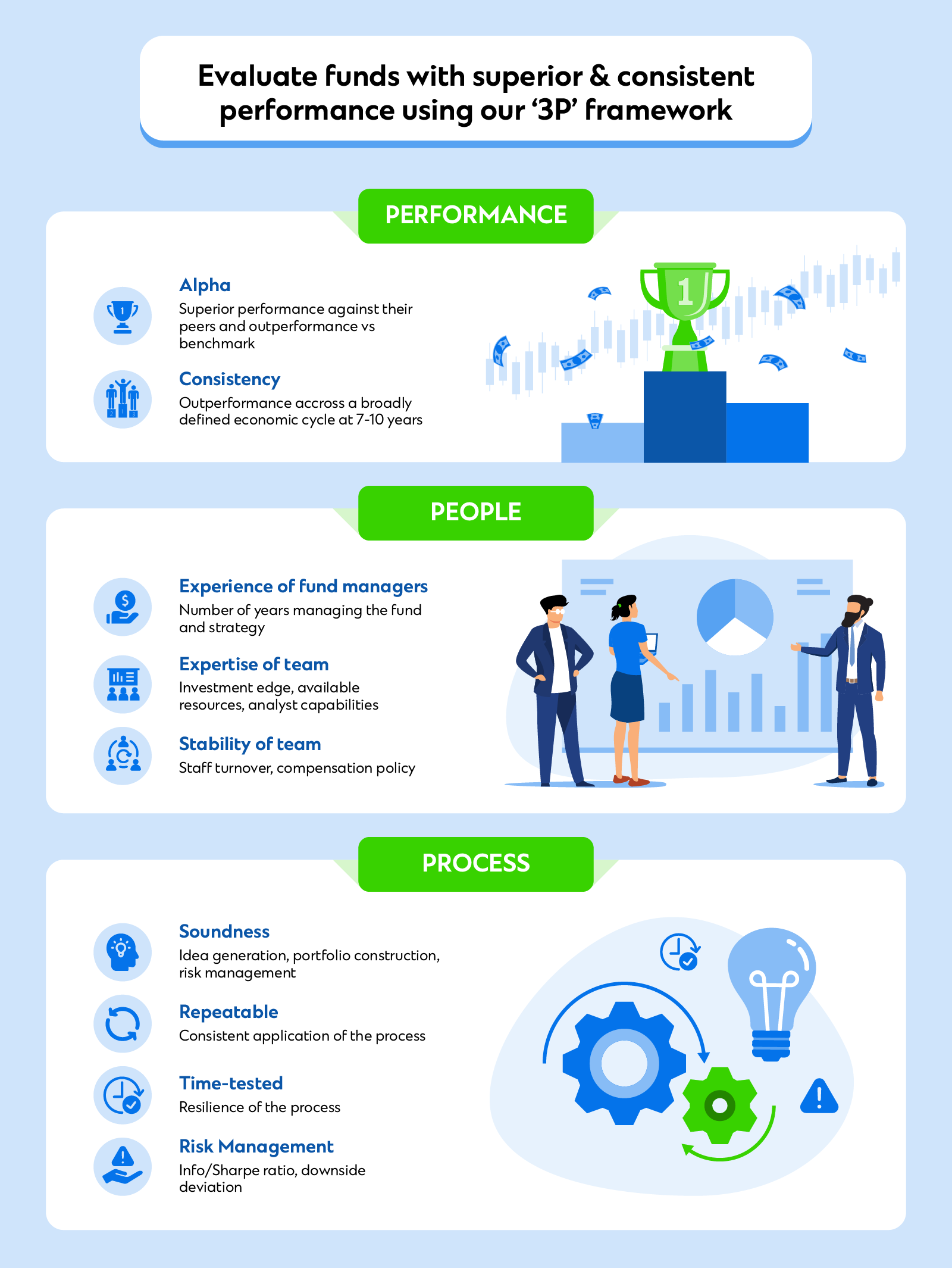 Regular interviews are conducted directly with the fund managers to assess the relevance and merit of their fund strategies. Funds are then scored according to Standard Chartered’s proprietary ‘3P’ framework of Performance, People and Process before further selection for approval.