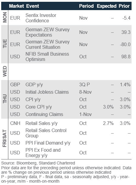 Potential technical rebound in GBP, more cautious on Gilts. Our previous bearish view on GBP/USD has played out as UK government bond yields fell sharply on concerns about impending growth slowdown as the government prepares to hike taxes in the 26 November budget. We expect the pair to trade in range with a mildly bullish bias heading into the budget. While UK government bonds still have a yield advantage against other Developed Market bonds, we recently closed our bullish opportunistic view on the bonds due to expected volatility ahead of the budget, locking in gains (see page 5).