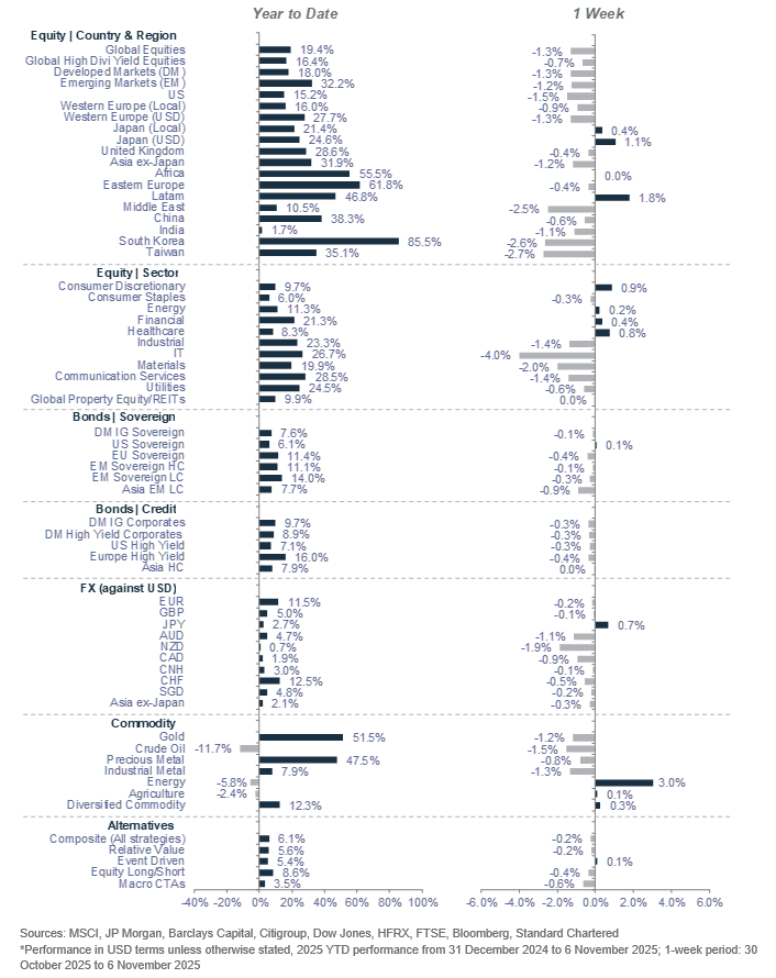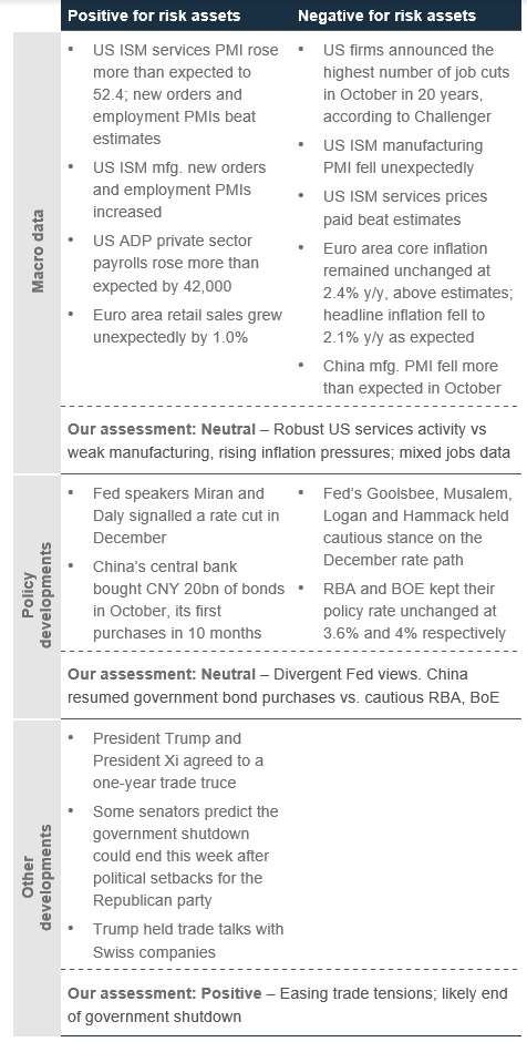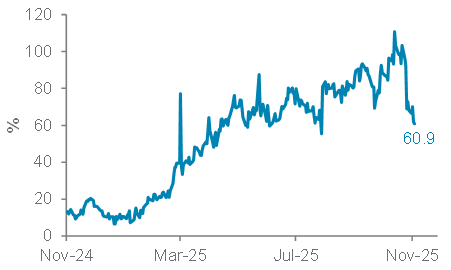 While still-bullish US equity investor positioning and elevated valuations could lead to 5-10% brief pullback in equities, US politics and the courts could provide the next catalysts for a year-end rally. The Republican party’s losses in local government polls this week should spur the party to agree with the Democrats to end the government shutdown. Meanwhile, the US Supreme Court, in its opening questions, appears to be sceptical about the legality of Trump’s tariff. A deal to end the US government shutdown and a potential rollback of US tariffs by the top court would be positive for risk assets into year-end.