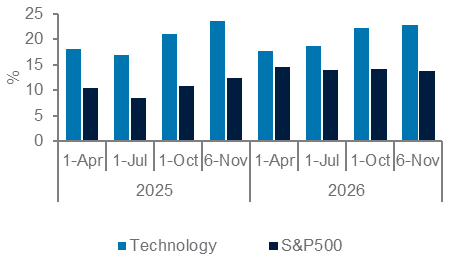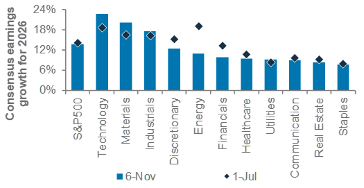 Consensus 2025 and 2026 earnings growth for the US technology sector has been revised higher throughout 2025