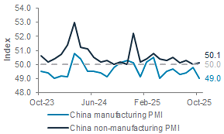 China’s manufacturing PMI fell more than expected in October; non-manufacturing PMI rose as expected