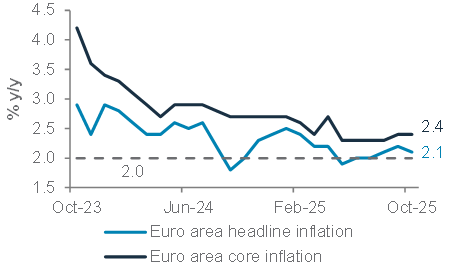 Euro area headline inflation eased to 2.1% y/y in October, nearing the ECB’s 2% target; this raises the chance of one last 25bps rate cut in December