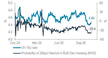 UK 10-year gilt yields, probability of a 25bps hike/cut in BoE December meeting