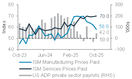 US ISM manufacturing and services prices paid indices, US ADP private sector payrolls