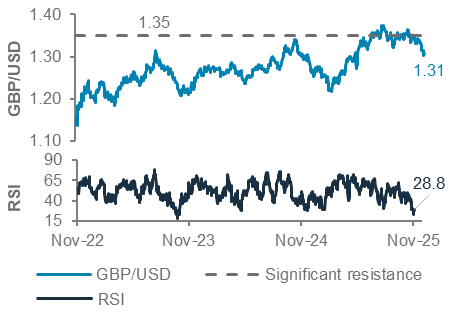 While lower policy rates are generally negative for a currency as they reduce investor demand, the markets have already priced-in expected rate cuts by the BoE. Moreover, the BoE’s projected terminal rate remains one of the highest amongst G10 central banks, supporting GBP’s appeal from a carry perspective and making short positions relatively expensive. Although the recent momentum continues to favour the USD, GBP/USD appears technically oversold, leaving scope for a short-term corrective rebound. We see the significant resistance around 1.35. Beyond this level, ongoing fiscal headwinds are likely to cap the upside to GBP/USD. Investors will be closely watching the UK Autumn budget, on 26 November.