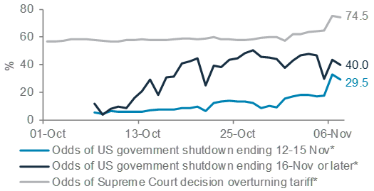 A deal to end the US government shutdown, following the Republican party’s losses in the latest local government elections, and a potential rollback of US tariffs by the Supreme Court would be positive for risk assets into year-end.