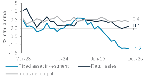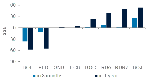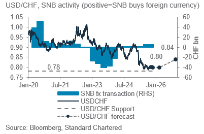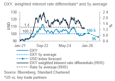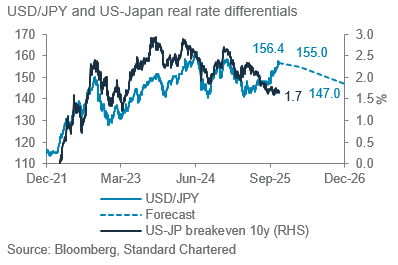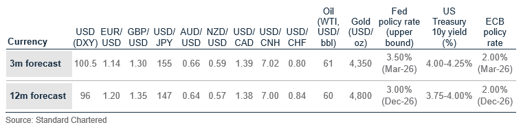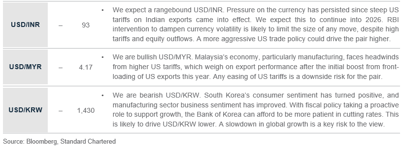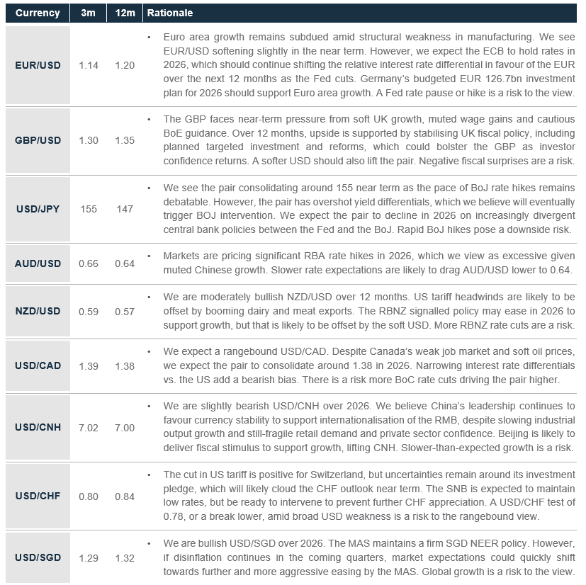 While we expect the USD index (DXY) to recover modestly over the next three months, depreciation to 96 is likely over a 12-month horizon. The USD recovery since September appears to be fading following soft US labour market data and expectations that the Fed will cut rates further in 2026. At the same time, hedging of USD exposure by foreign investors – which had pressured the USD earlier in 2025 – has slowed. On balance, this means we expect stabilisation or a modest rebound of the USD over a shorter 1-3 month horizon, supported by safe-haven demand. Over a longer 6-12-month horizon, though, gradual USD weakness is expected to persist as Fed rate cuts to support a cooling job market reduce the USD’s yield advantage versus other major currencies. Among major currencies, we expect the USD to depreciate most versus the JPY (USD/JPY to fall towards 147) and EUR (EUR/USD to rise to 1.20).