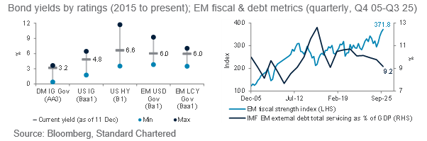 EM USD bonds should also benefit from gradually lower US government bond yields – we expect the US 10-year bond yield to gradually ease to 3.75-4.00% over 6-12 months – and a modestly steeper US yield curve given our expectation of three Fed rate cuts in 2026.